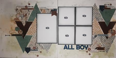 Create a double page layout using a 20cm x 20cm booklet for the patterns and add in a little mixed media. We used our About a Boy collection.